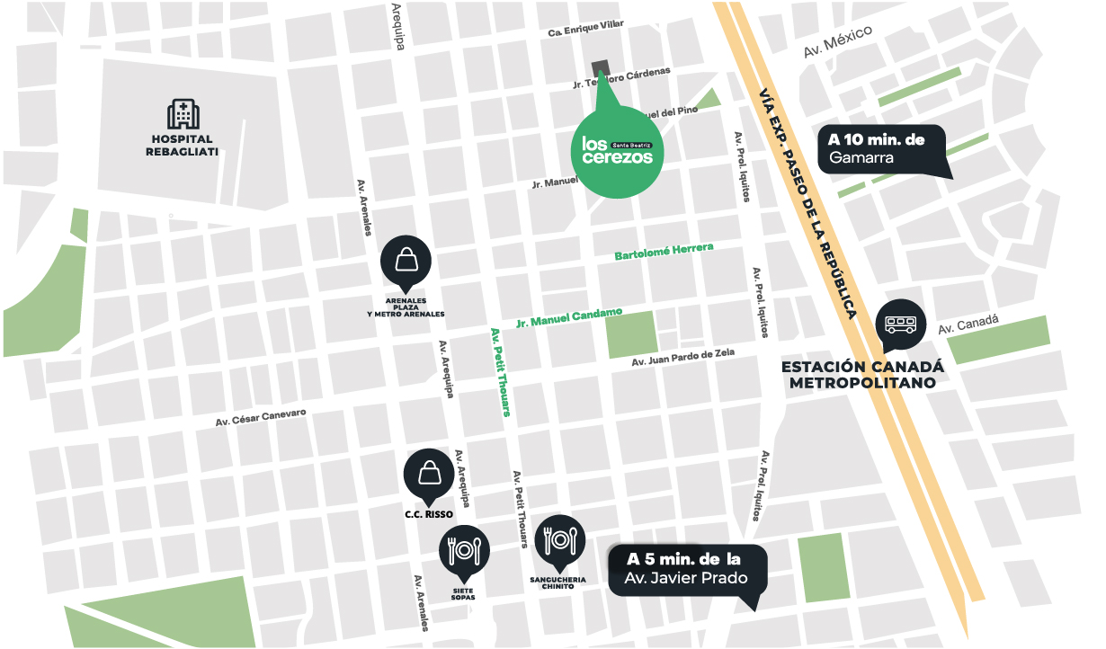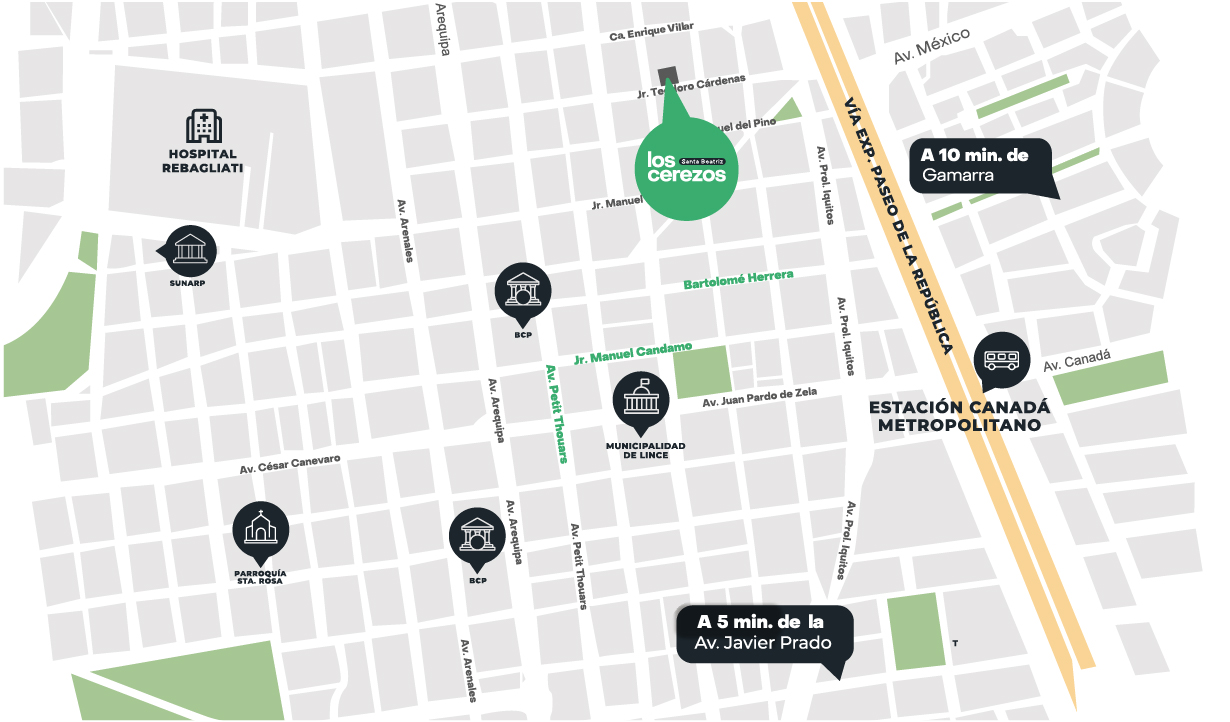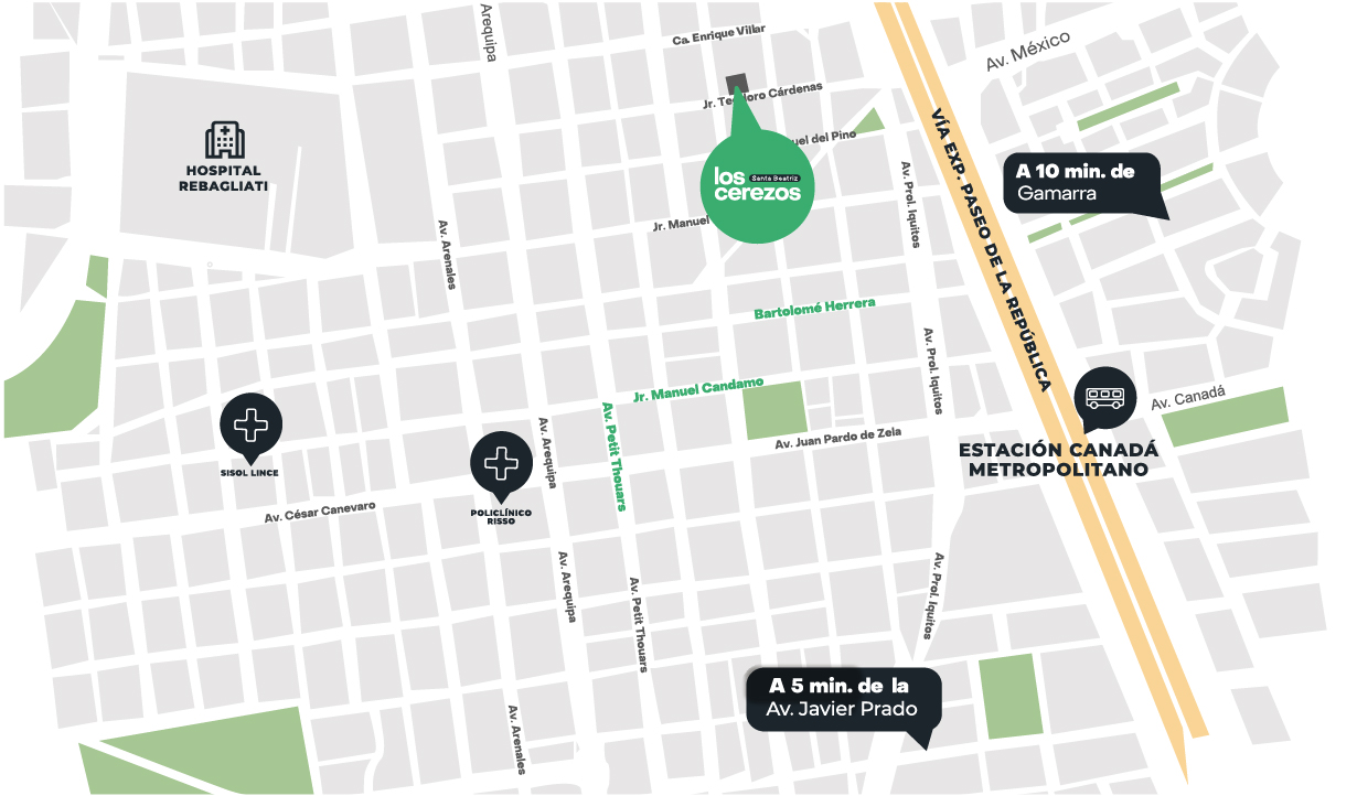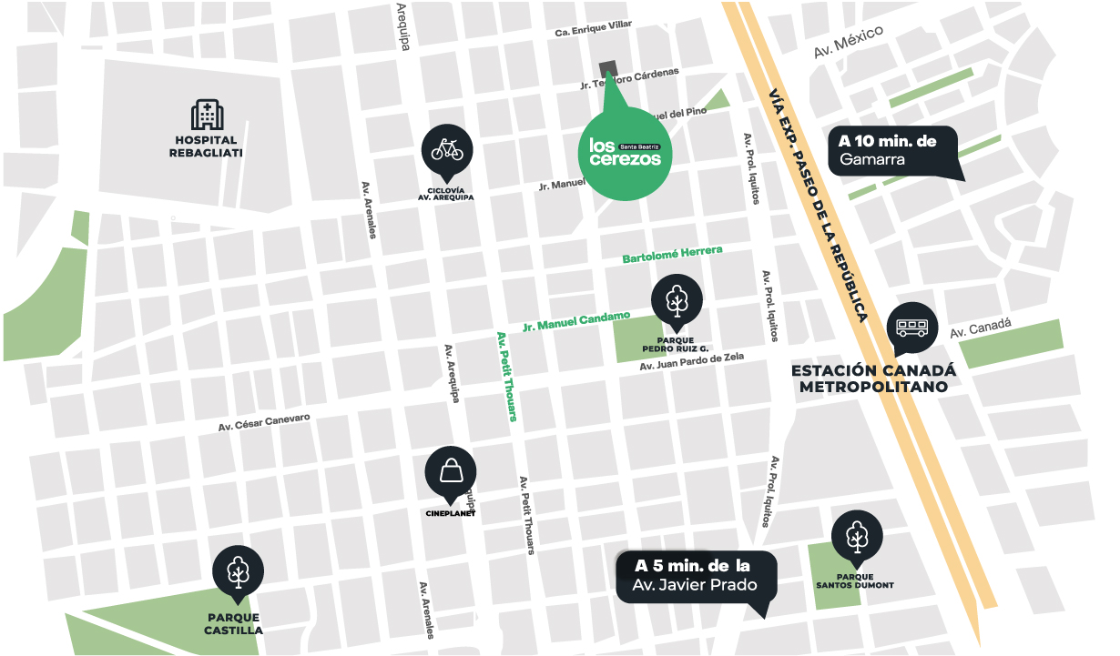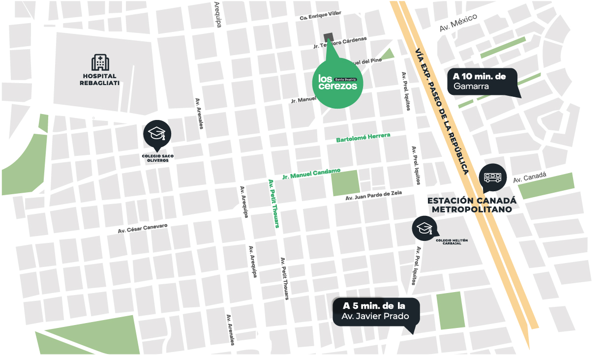 Los Cerezos es un proyecto moderno con departamentos de 1 y 2 dormitorios, diseñados para tu comodidad y tu ritmo de vida, con áreas comunes como lobby, coworking, parrillas, bike parking, salón gourmet y terraza. Ubicado en el barrio tradicional de Santa Beatriz, estarás cerca de avenidas principales, parques, la ciclovía de la Av. Arequipa, colegios, bancos y centros comerciales. El proyecto contará con certificación sostenible EDGE y acceso a los beneficios del programa Mivivienda, ideal para comprar tu primer hogar.